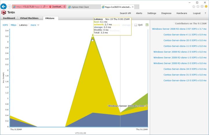 In Bezug auf die Bedienbarkeit des Systems im laufenden Betrieb könnte das Web Interface in manchen Fällen etwas flüssiger reagieren. Die Software ist zwar nicht so träge, dass man wirklich warten muss, manchmal dauert der Aufbau einer aufgerufenen Seite aber so lang, dass der Arbeitsfluss gestört wird. Laut Tintri ist das teilweise so gewollt, da auf diese Weise sicher gestellt wird, dass das Konfigurationswerkzeug die Gesamtperformance der Appliance nicht negativ beeinflussen kann. Unsere Kritik bezieht sich auch ausdrücklich nur auf die Seitendarstellung, die über das Web-Interface angestoßenen Aufgaben, wie etwa das Erstellen von Clones, laufen sehr schnell im Hintergrund ab.