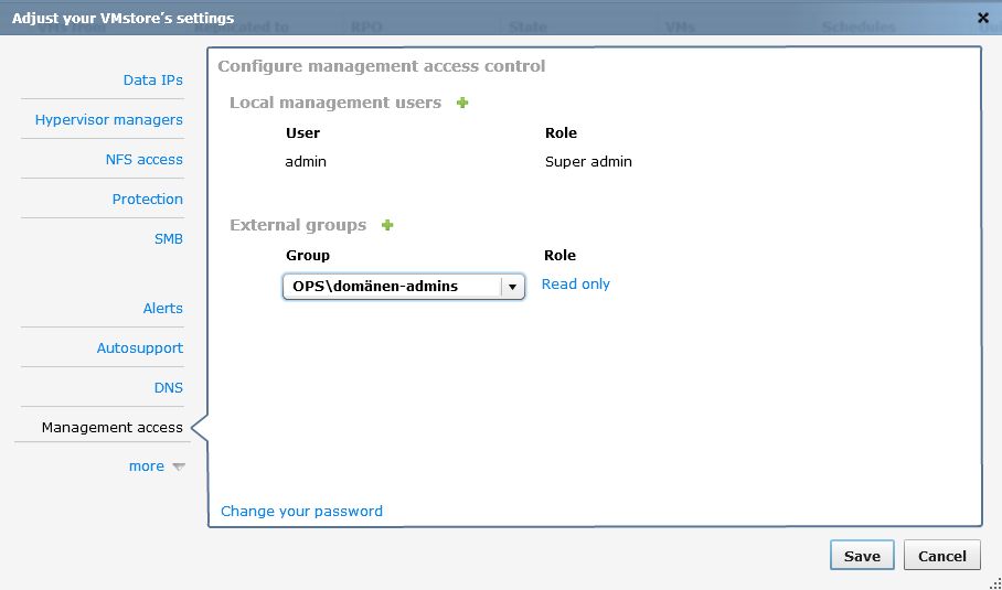 Der Autosupport-Bereich dient dazu, der Appliance zu erlauben, dem Tintri-Support automatische Reports mit dem Namen der Ansprechpartner, der dazugehörigen Mailadresse und Telefonnummer sowie dem Ort zu schicken und unter „DNS“ findet die Konfiguration der DNS-Server statt. Interessanter ist der Management Access. Hier legen die Verantwortlichen nämlich fest, wer die Appliance verwalten darf. Neben einer lokalen Benutzerdatenbank unterstützt Tintri OS hierfür auch LDAP und das Active Directory.