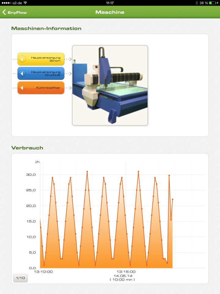 Die Übertragung der Daten auf das iPad erfolgt dabei über WLAN. Dabei hat der User für die Auswahl der Maschine zwei Möglichkeiten. Einerseits wird ihm über die Drahtlos-Verbindung eine Maschinen-Liste angezeigt, aus welcher er die gewünschte Maschine auswählen und deren Energieauslastung überprüfen kann. Zum anderen wurde eine Adhoc-Transparenz durch QR-Codes eingerichtet. Dafür wurden an speziellen signifikanten Punkten QR-Tags appliziert, die durch eine Scan-Funktion in der App lesbar sind. Sofern also ein Anwender seine Produktion durchläuft, vor einer Maschine steht und unmittelbar Informationen über diese beziehen möchte, kann er mittels des Scans die Informationen sofort auf seinem Tablet einsehen.
